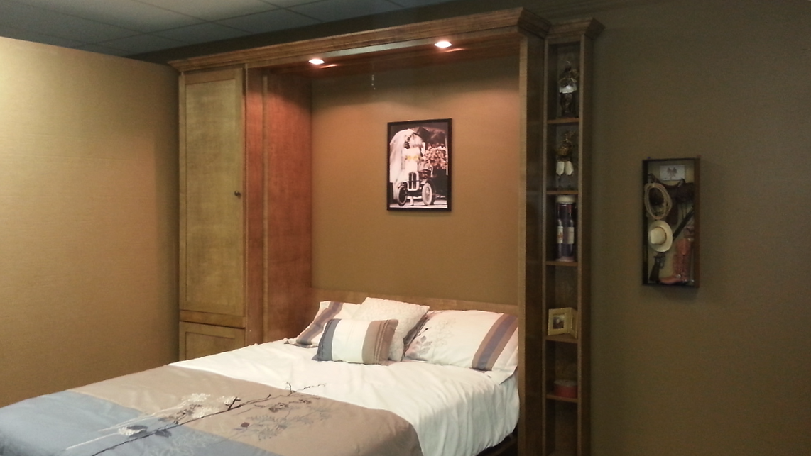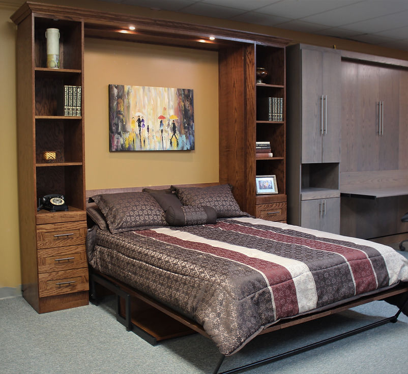 The Templeton Murphy bed with desk is a shaker style face that is divided into four doors with 2 1/4″ trim. It gives the appearance of four doors above the desk.