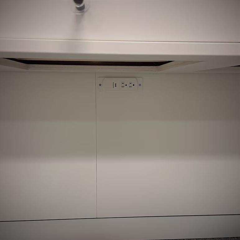 We embedded a TV onto the front of the bed. Most TVs are supplied by the customer. This one has a 55″ Samsung Frame TV.