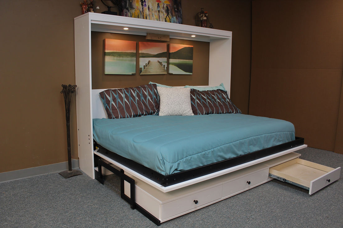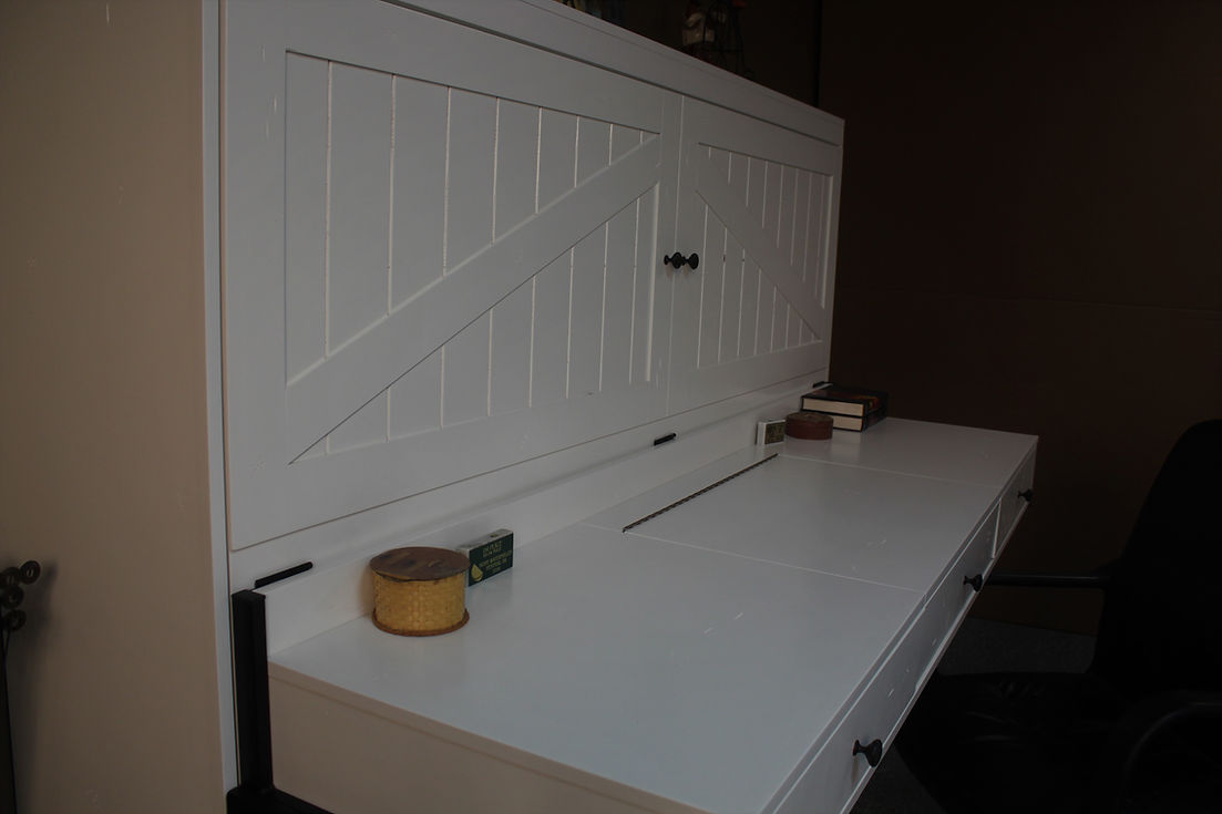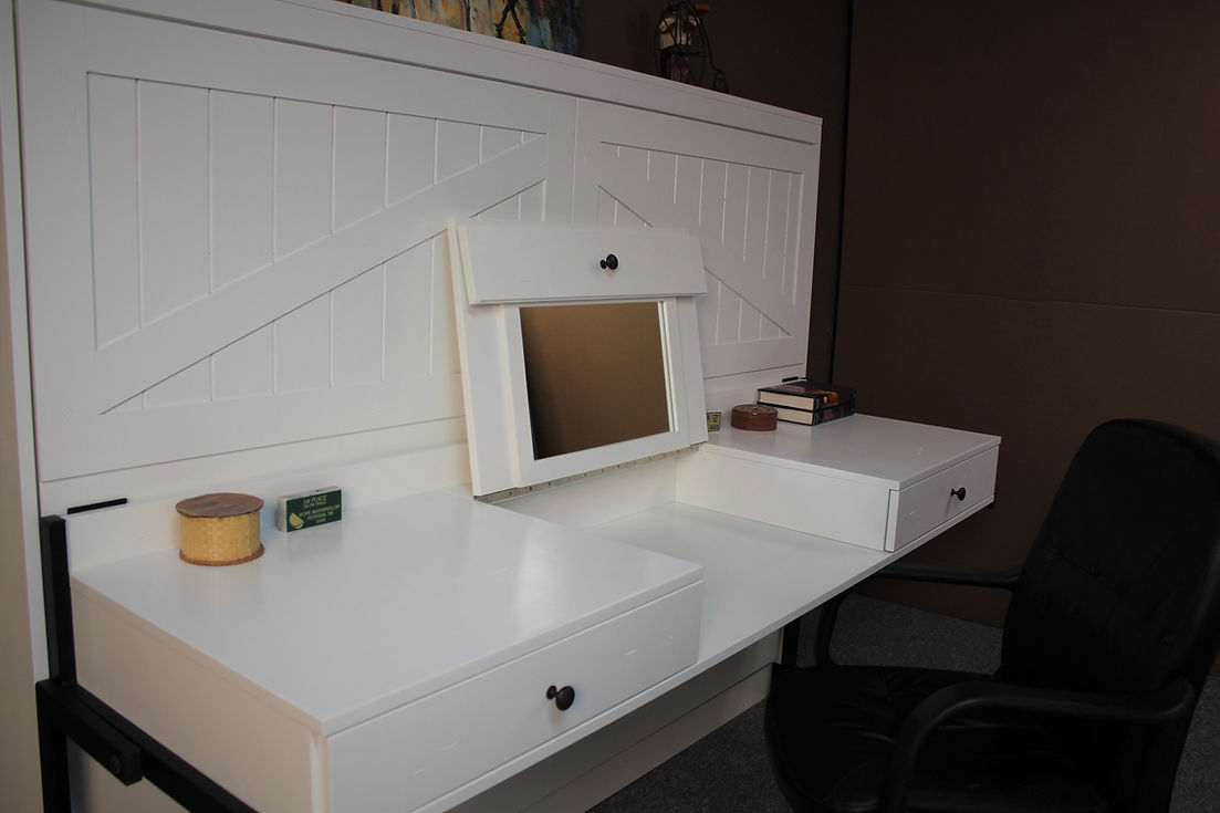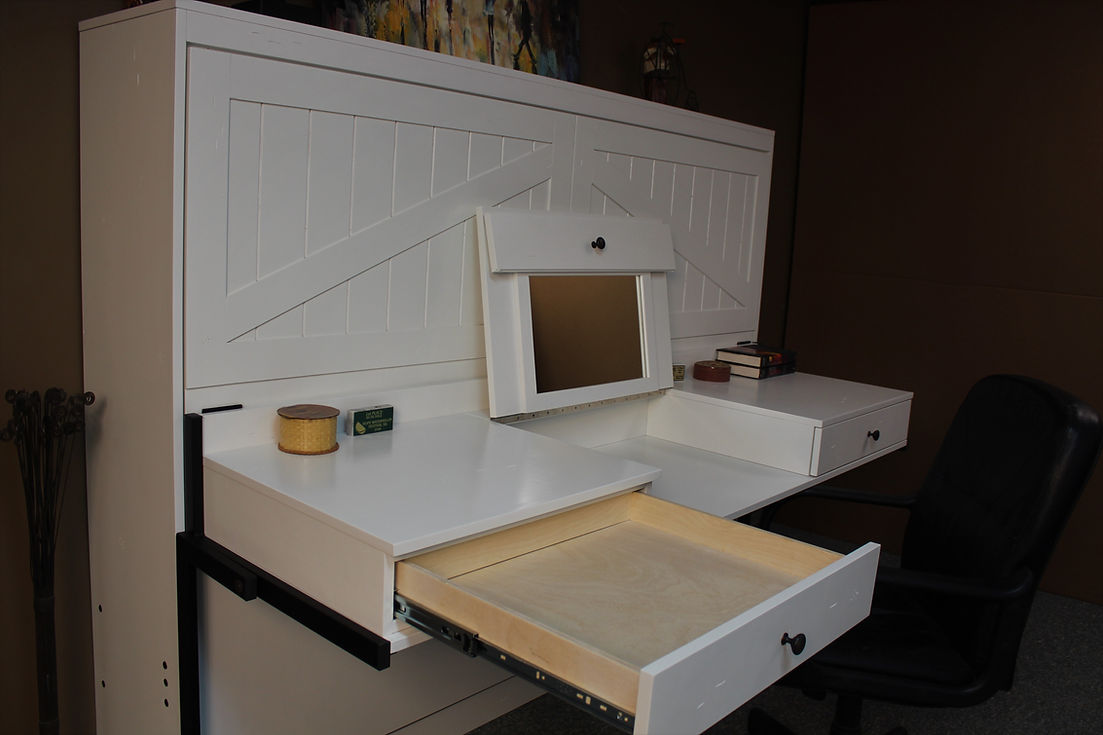 This is a Murphy bed with a barn door look to the face. This bed not only has a Stay-Level Desk but drawers or a vanity on top of the desk.