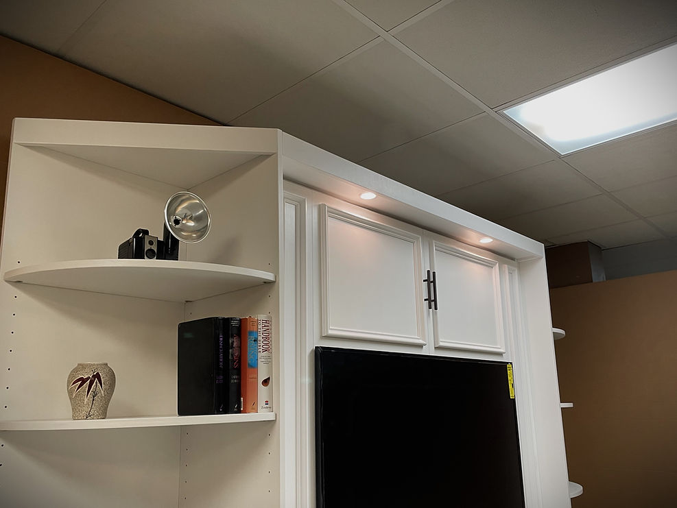 Clarke 09/06/24 TV Murphy Bed with New Yorker Trim and Custom Bookcases Showing the LED Outset Lights