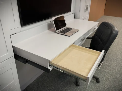 At first glance, the Templeton’s shaker-style molding gives it a timeless, built-in look. But the real showstopper is the 55″ Samsung Frame TV mounted directly onto the bed face. When the bed is closed, the room feels like a high-end media space – perfect for watching movies or using the TV as a large monitor while working at the desk.