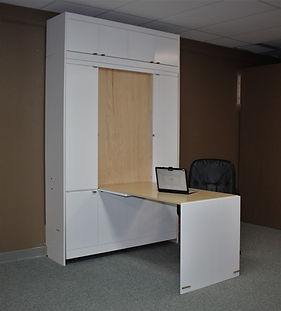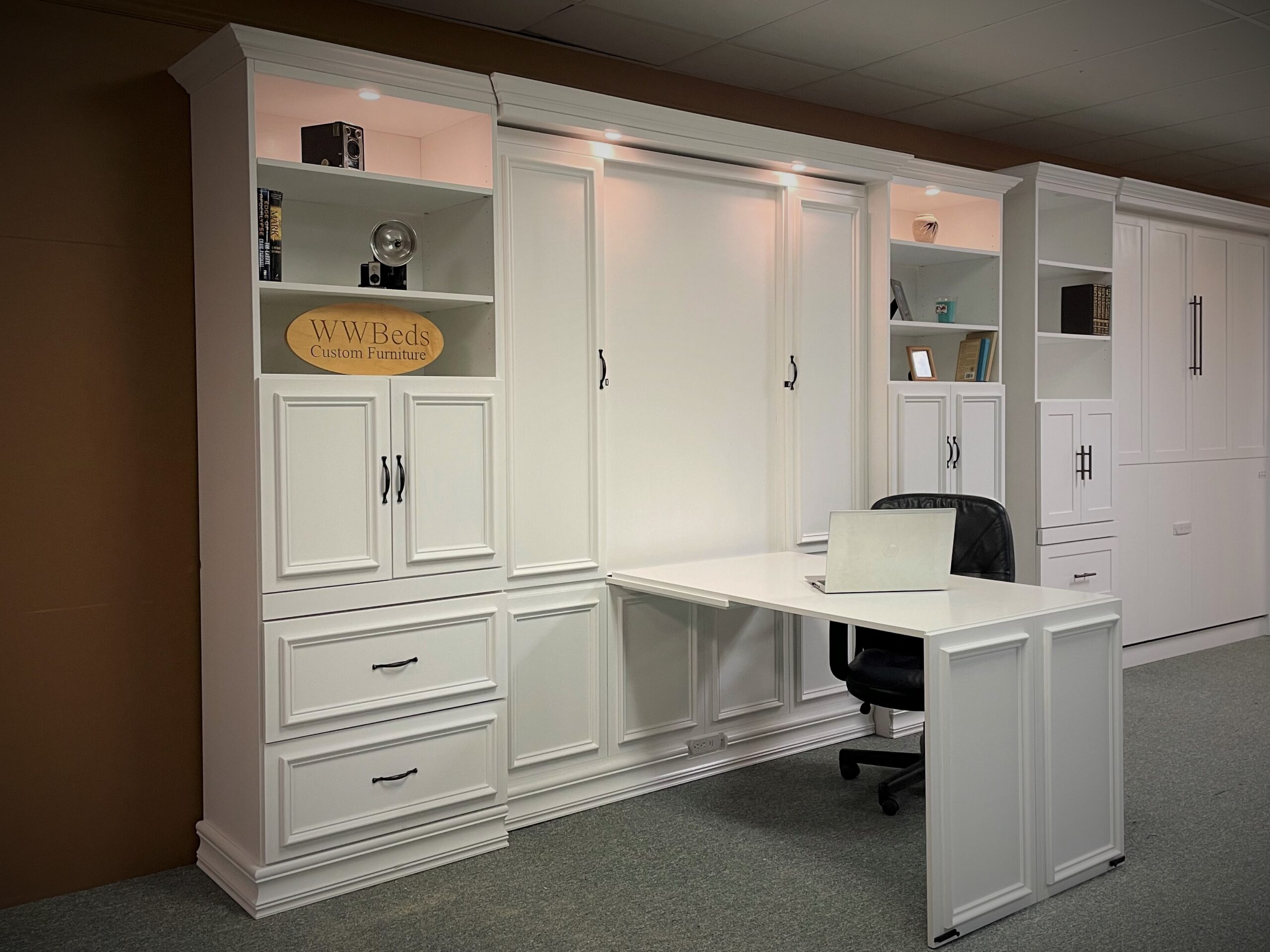 This is a version of our Craftsman sytle but in white. With the same flat panel doors, this folding desk murphy bed has a real nice and clean look to it.