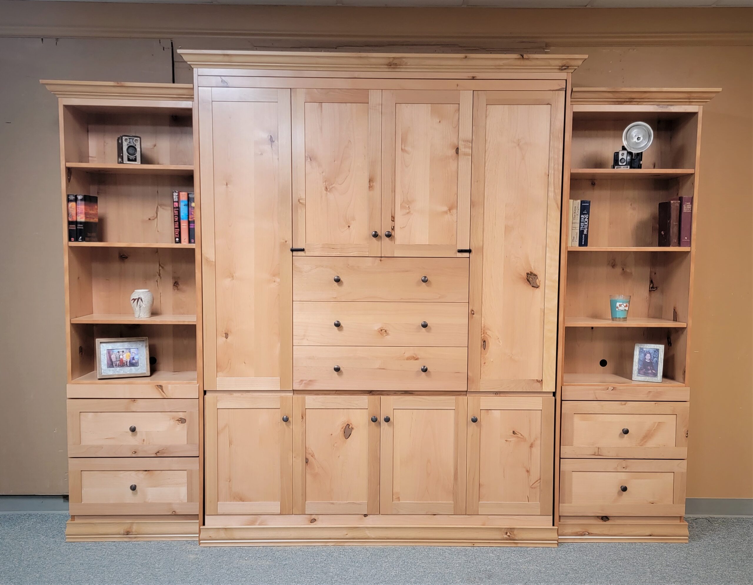 The New Yorker features doors with applied molding and a bookcase above the Murphy bed.  It can be sold with out a hidden desk or with both the standard desk and the double fold.